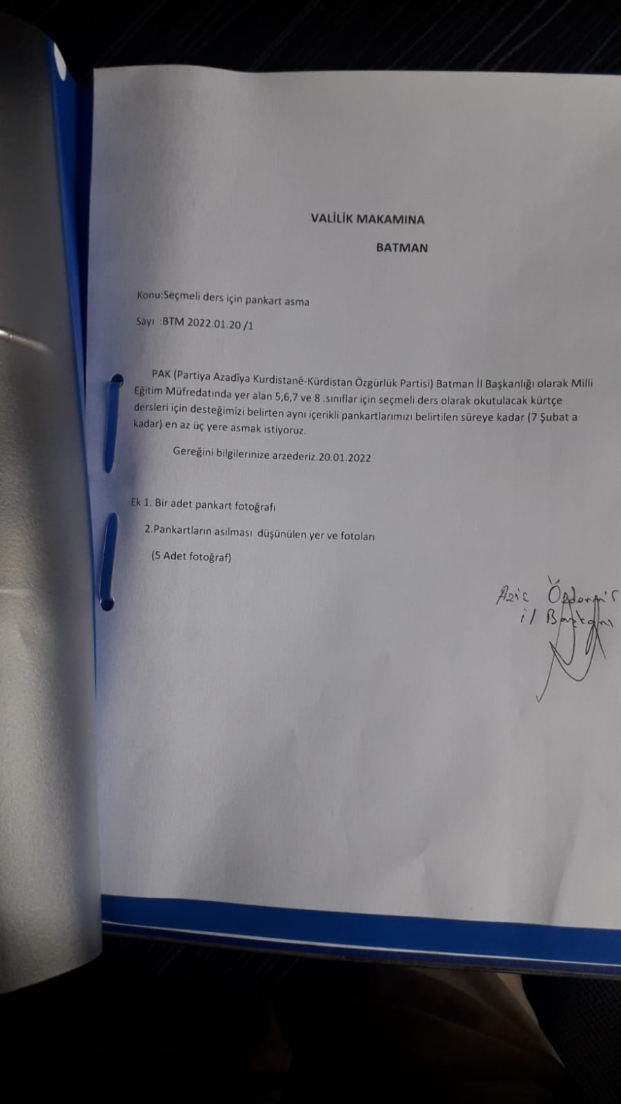 Wek prosedura yasayî Serokê Teşkîlata Batmanê(Êlih) ya PAKê Birêz Azîz Ozdemîr roja 20.01.2022yê serî li Parêzgeha Batmanê da ku bikaribe îzna pankartan bigire.
