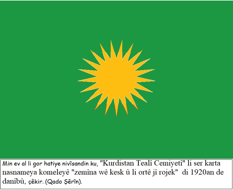 Di wan du sê salên ku komeleya “KurdistanTealî Cemiyetî” çalak bû, kertek boyî danasîna komeleyê hatibû çêkirin, li ser wê kerta nasnameya komeleyê “zemîna wê kesk û li ortê jî rojek” alek Kurdî çapkiribûn. Hatiye nivîsandin ku ev al ji aliyê “Katibê Umûmî yê komeleyê Zeynelabidîn hatibû çêkirin”.