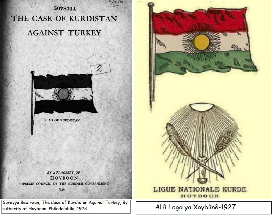 Meseleya li ser berga pirtûka Sureyya Bedirxan ku, ew yek ji xebatkar û damezerên Xoybûnê bû, ala kurdan bi rengînî hatiye çapkirin û li binê alê jî bi îngilizî “Flag of Kurdistan” ango Ala Kurdistanê hatiye nivîsîn. (Sureyya Bedirxan, The Case of Kurdistan Against Turkey, By authority of Hoyboon, Philadelphila, 1928).